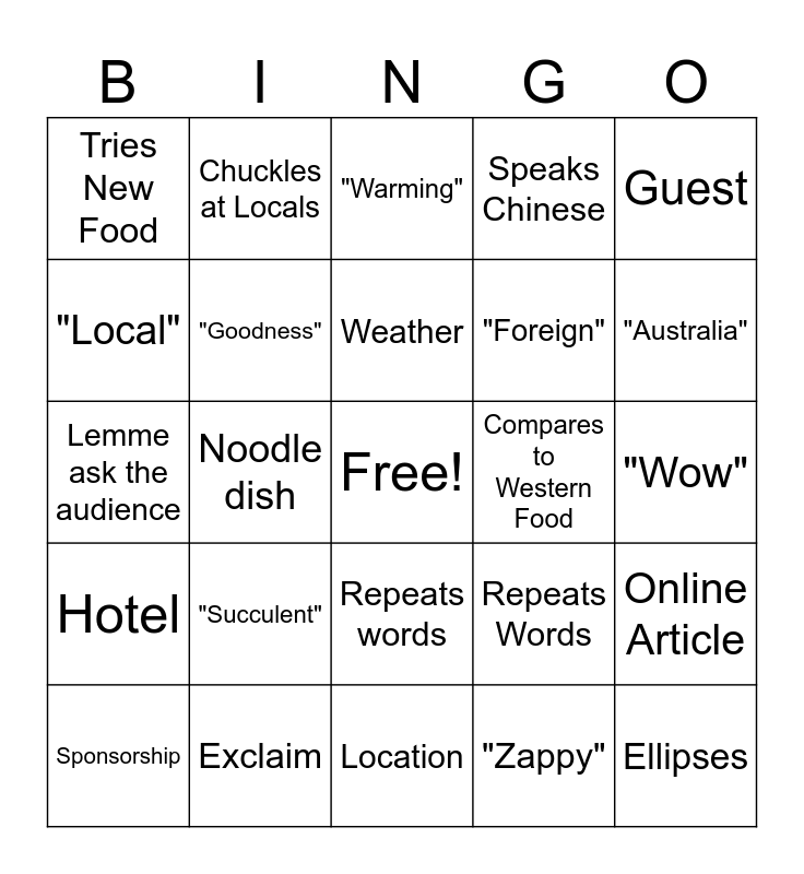 This bingo card has a free space and 24 words: Sponsorship, "Succulent", Weather, "Zappy", Guest, Tries New Food, Chuckles at Locals, "Warming", Compares to Western Food, "Wow", Lemme ask the audience, "Goodness", Repeats Words, Online Article, "Local", Exclaim, Location, Speaks Chinese, "Australia", Hotel, Noodle dish, Repeats words, "Foreign" and Ellipses.