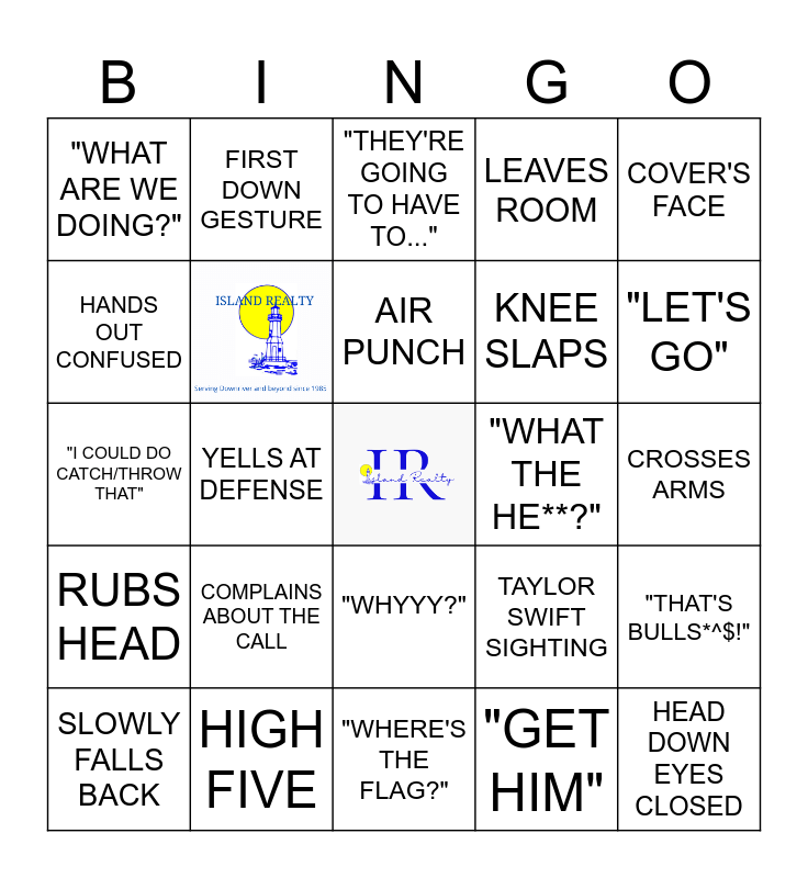 This bingo card has 2 images, a free space and 24 words: "WHYYY?", "GET HIM", AIR PUNCH, HIGH FIVE, COVER'S FACE, "WHAT ARE WE DOING?", HANDS OUT CONFUSED, FIRST DOWN GESTURE, CROSSES ARMS, TAYLOR SWIFT SIGHTING, KNEE SLAPS, "I COULD DO CATCH/THROW THAT", "THAT'S BULLS*^$!", SLOWLY FALLS BACK, YELLS AT DEFENSE, OPENS A BEER, LEAVES ROOM, RUBS HEAD, "THEY'RE GOING TO HAVE TO...", HEAD DOWN EYES CLOSED, "LET'S GO", "WHERE'S THE FLAG?", "WHAT THE HE**?" and COMPLAINS ABOUT THE CALL.