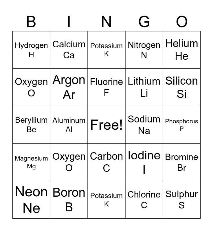 This bingo card has a free space and 24 words: Oxygen O, Boron B, Fluorine F, Neon Ne, Helium He, Hydrogen H, Oxygen O, Calcium Ca, Sodium Na, Carbon C, Lithium Li, Beryllium Be, Iodine I, Bromine Br, Argon Ar, Chlorine C, Phosphorus P, Potassium K, Silicon Si, Aluminum Al, Sulphur S, Magnesium Mg, Nitrogen N and Potassium K.