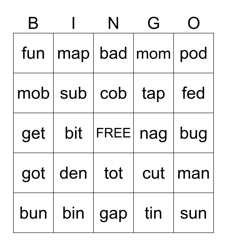 This bingo card has a free space and 24 words: den, bin, cob, bun, pod, fun, mob, map, nag, tot, tap, get, cut, man, sub, tin, bug, bad, fed, bit, sun, got, mom and gap.