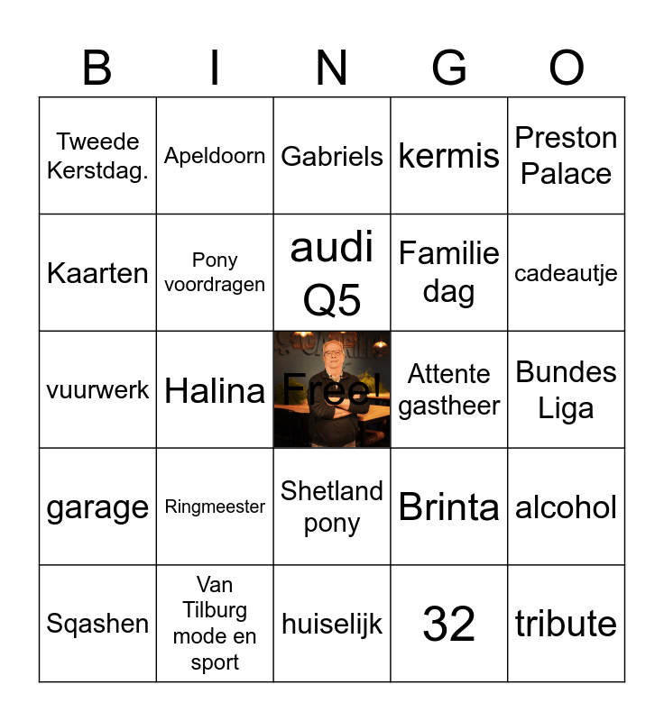This bingo card has a free space and 26 words: Shetland pony, 32, audi Q5, Van Tilburg mode en sport, Preston Palace, Tweede Kerstdag., Kaarten, Apeldoorn, Bundes Liga, Brinta, Familie dag, vuurwerk, alcohol, Sqashen, Halina, Op het veld 1, kermis, garage, Gabriels, tribute, cadeautje, huiselijk, Attente gastheer, Ringmeester, Pony voordragen and SARA.