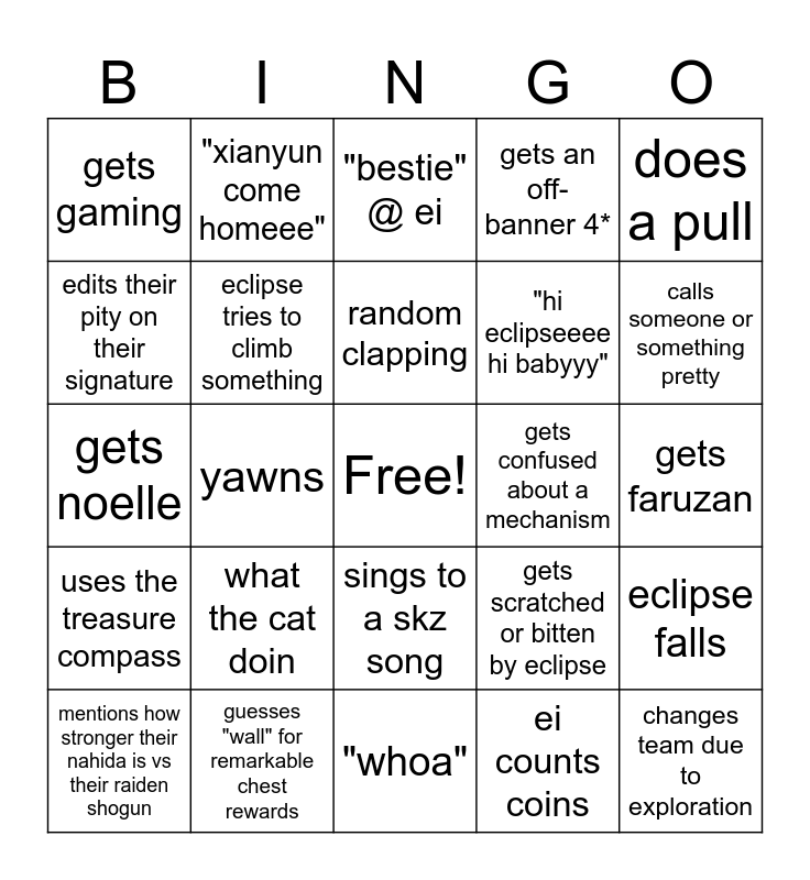 This bingo card has a free space and 24 words: what the cat doin, guesses "wall" for remarkable chest rewards, random clapping, mentions how stronger their nahida is vs their raiden shogun, does a pull, gets gaming, edits their pity on their signature, "xianyun come homeee", gets confused about a mechanism, sings to a skz song, "hi eclipseeee hi babyyy", gets noelle, gets scratched or bitten by eclipse, eclipse falls, eclipse tries to climb something, ei counts coins, gets faruzan, "bestie" @ ei, calls someone or something pretty, yawns, changes team due to exploration, uses the treasure compass, gets an off-banner 4* and "whoa".