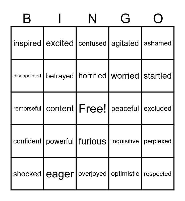 This bingo card has a free space and 35 words: humiliated, bitter, frustrated, betrayed, furious, agitated, disappointed, appalled, horrified, guilty, remorseful, ashamed, vulnerable, depressed, inspired, peaceful, optimistic, content, confident, respected, inquisitive, shocked, perplexed, eager, confused, startled, amazed, apathetic, worried, excluded, insecure, overjoyed, powerful, excited and ecstatic.