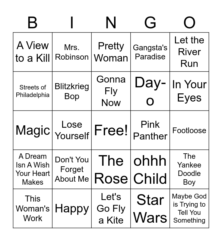 This bingo card has a free space and 63 words: Puttin' on the Ritz, Old Time Rock and Roll, Ding Dong! The Witch Is Dead, The Yankee Doodle Boy, America, I Could Have Danced All Night, Mrs. Robinson, Suicide Is Painless, Gonna Fly Now, Summer Nights, The Rose, Arthur's Theme (Best That You Can Do), Footloose, Let the River Run, Unchained Melody, Streets of Philadelphia, Lose Yourself, A View to a Kill, I don’t want to miss a thing, Day-o, Don't You Forget About Me, A Dream Isn A Wish Your Heart Makes, Gangsta's Paradise, We Don't Talk About Bruno, Father of the Bride, Let it go, You're the One That I Want, You're a Mean One Mr. Grinch, Bare Necessities, Circle of Life, Nothing's Gonna Stop Us Now, Dancing Queen, Colors of the Wind, Washington Ending, In Your Eyes, This Woman's Work, My Guy (My God), Star Wars, Danger Zone, Blitzkrieg Bop, Magic, Pink Panther, Power of Love, Hold On, Maybe God is Trying to Tell You Something, Happy, You Sexy Thing, ohhh Child, La Bamba, Something to talk about, God Only Knows, Let's Go Fly a Kite, You're Welcome, My Girl, Close to you, Pretty Woman, ROCK in the USA, Time Warp, Wink and a Smile, Take My Breath Away, Because You Loved Me, Xanadu and Pinball Wizard.