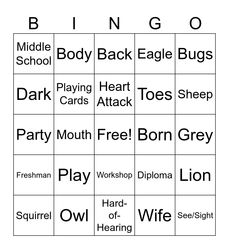 This bingo card has a free space and 34 words: Silver, Wife, Public School, Horseback Riding, Freshman, Playing Cards, Bugs, Squirrel, Body, Touch, Heart Attack, Back, Rainbow, Face, Born, Sheep, Owl, Party, Play, Diploma, Workshop, Project, Middle School, Grey, Hard-of-Hearing, See/Sight, Eagle, A Cold, Toes, Dark, Pneumonia, Mouth, Lion and Game.