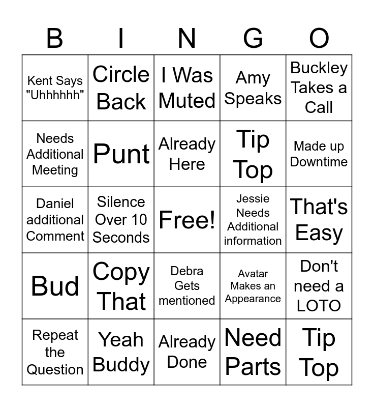 This bingo card has a free space and 26 words: Debra Gets mentioned, Need Parts, Already Here, Yeah Buddy, Buckley Takes a Call, Kent Says "Uhhhhhh", Needs Additional Meeting, Circle Back, That's Easy, Avatar Makes an Appearance, Tip Top, Daniel additional Comment, Don't need a LOTO, Repeat the Question, Silence Over 10 Seconds, Reach Out, Amy Speaks, Bud, I Was Muted, Tip Top, Made up Downtime, Already Done, Jessie Needs Additional information, Copy That, Punt and Pushed Event.