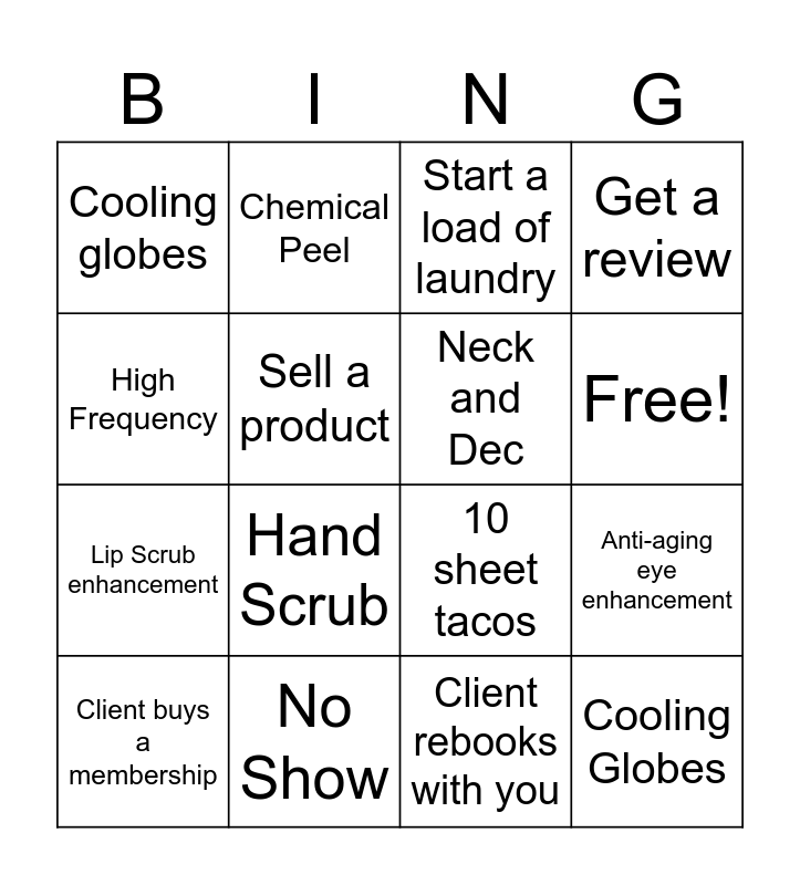 This bingo card has 17 words: Client rebooks with you, Client buys a membership, Start a load of laundry, Cooling globes, Hand Scrub, Get a review, Anti-aging eye enhancement, Neck and Dec, Free!, Sell a product, No Show, 10 sheet tacos, High Frequency, Chemical Peel, Lip Scrub enhancement, Move laundry to dryer and Cooling Globes.