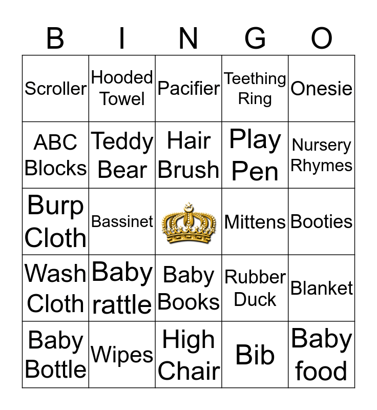 This bingo card has a free space and 29 words: Baby Bottle, Diapers, Bassinet, Crib, Scroller, Pacifier, Teddy Bear, Baby rattle, Mittens, Wipes, Booties, Baby food, High Chair, Bib, Nursery Rhymes, Socks, Baby Books, Wash Cloth, Onesie, Burp Cloth, Rubber Duck, Bath Tub, Play Pen, ABC Blocks, Teething Ring, Hooded Towel, Blanket, Hair Brush and Thermometer.
