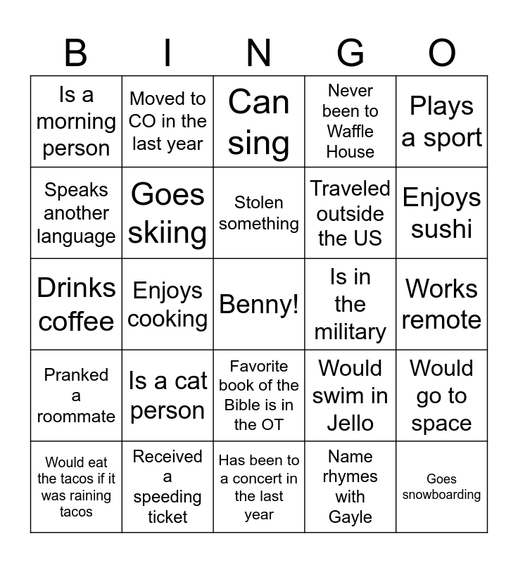 This bingo card has a free space and 31 words: Has been to a concert in the last year, Has met a famous person, Enjoys cooking, Is a youngest child, Is a morning person, Can sing, Goes skiing, Would swim in Jello, Is in the military, Name rhymes with Gayle, Works remote, Goes snowboarding, Wears socks with sandals, Is a lefty, Enjoys sushi, Favorite color is, Would go to space, Is a cat person, Pranked a roommate, Favorite book of the Bible is in the OT, Plays a sport, Loves camping, Would eat the tacos if it was raining tacos, Moved to CO in the last year, Traveled outside the US, Speaks another language, Never been to Waffle House, Drinks coffee, Received a speeding ticket, Stolen something and Is a dog person.