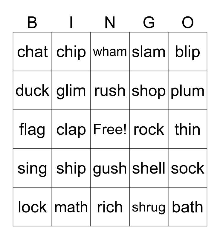 This bingo card has a free space and 25 words: ship, rich, rush, lock, blip, chat, duck, chip, rock, gush, shop, flag, shell, sock, glim, chop, thin, wham, plum, clap, bath, math, sing, slam and shrug.