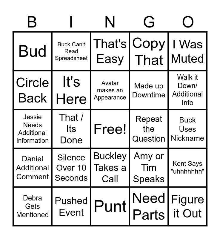 This bingo card has a free space and 24 words: Debra Gets Mentioned, Silence Over 10 Seconds, Avatar makes an Appearance, Need Parts, I Was Muted, Bud, Buck Can't Read Spreadsheet, That's Easy, Repeat the Question, Buck Uses Nickname, Jessie Needs Additional Information, It's Here, Amy or Tim Speaks, Kent Says "uhhhhhhh", Circle Back, Pushed Event, Punt, Copy That, Walk it Down/ Additional Info, Daniel Additional Comment, That / Its Done, Buckley Takes a Call, Made up Downtime and Figure it Out.