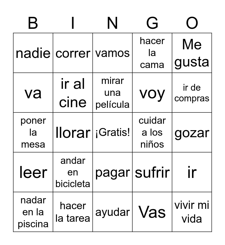 This bingo card has a free space and 28 words: ir, van, voy, Vas, va, vamos, correr, leer, cuidar a los niños, nadar en la piscina, poner la mesa, hacer la cama, hacer la tarea, ayudar, ir de compras, dar un paseo, andar en bicicleta, ir al cine, mirar una película, pagar, nadie, reír, vivir mi vida, llorar, gozar, sufrir, Me gusta and Me gustaría.