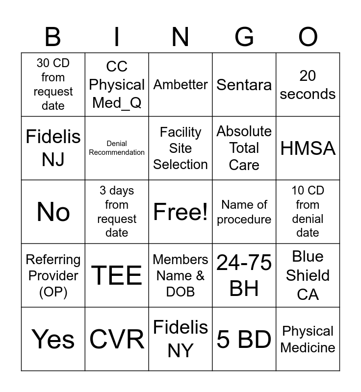 This bingo card has a free space and 27 words: 24-75 BH, TTE, Absolute Total Care, Fidelis NY, Fidelis NJ, Ambetter, CC Physical Med_Q, Referring Provider (OP), Name of procedure, Blue Shield CA, No, Sentara, Yes, CVR, HMSA, Admin Pend, Denial Recommendation, Facility Site Selection, TEE, 30 CD from request date, 10 CD from denial date, 5 BD, 3 days from request date, Physical Medicine, Members Name & DOB, 20 seconds and Tax ID.