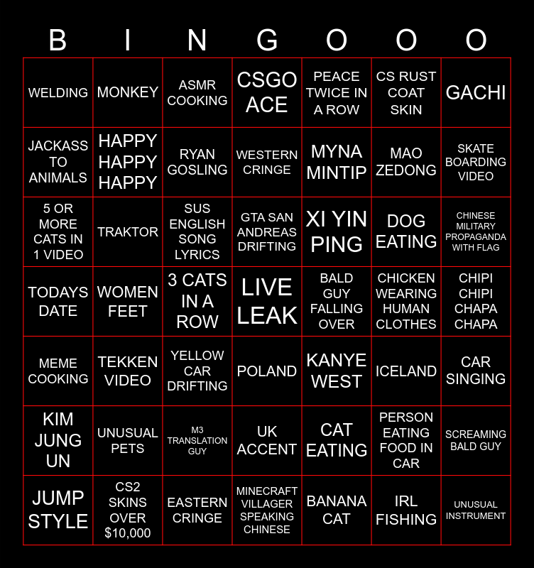 This bingo card has a free space and 48 words: CAT EATING, MAO ZEDONG, MINECRAFT VILLAGER SPEAKING CHINESE, WOMEN FEET, SUS ENGLISH SONG LYRICS, CHIPI CHIPI CHAPA CHAPA, MONKEY, CS2 SKINS OVER $10,000, CS RUST COAT SKIN, POLAND, GACHI, CSGO ACE, DOG EATING, XI YIN PING, KIM JUNG UN, CHICKEN WEARING HUMAN CLOTHES, JACKASS TO ANIMALS, SKATE BOARDING VIDEO, PERSON EATING FOOD IN CAR, PEACE TWICE IN A ROW, MYNA MINTIP, 3 CATS IN A ROW, WELDING, HAPPY HAPPY HAPPY, SCREAMING BALD GUY, RYAN GOSLING, CHINESE MILITARY PROPAGANDA WITH FLAG, JUMP STYLE, GTA SAN ANDREAS DRIFTING, TRAKTOR, IRL FISHING, BALD GUY FALLING OVER, CAR SINGING, UNUSUAL PETS, TODAYS DATE, KANYE WEST, ICELAND, 5 OR MORE CATS IN 1 VIDEO, YELLOW CAR DRIFTING, M3 TRANSLATION GUY, MEME COOKING, UNUSUAL INSTRUMENT, ASMR COOKING, EASTERN CRINGE, WESTERN CRINGE, UK ACCENT, TEKKEN VIDEO and BANANA CAT.