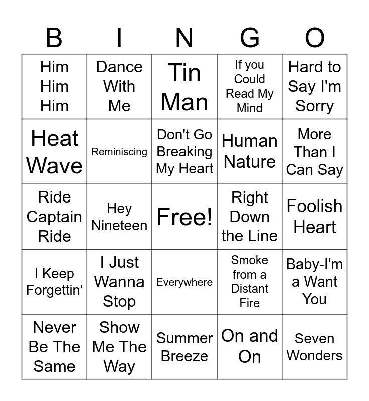 This bingo card has a free space and 63 words: After the Love Has Gone, Arthur's Theme, Baby Come Back, Baby-I'm a Want You, Baker Street, Biggest Part of Me, Dance With Me, Diamond Girl, Don't Go Breaking My Heart, Easy Lover, Everywhere, Eye in the Sky, Foolish Heart, Hard to Say I'm Sorry, He's So Shy, Heat Wave, Hey Nineteen, Him Him Him, How Much I Feel, Human Nature, I Just Wanna Stop, I Keep Forgettin', If you Could Read My Mind, If You Leave Me Now, It Don't Matter to Me, Kokomo, Lido Shuffle, Listen to the Music, Love Will Find a Way, Lovely Day, Lowdown, Magic, Mexico, Minute by Minute, More Than I Can Say, Never Be The Same, Nothin' But a Heartache, On and On, Peg, Reminiscing, Ride Captain Ride, Right Down the Line, Rikki Don't Lose that Number, Sailing, Seven Wonders, Show Me The Way, Slow Hand, Smoke from a Distant Fire, So Into You, Something Special, Still the One, Summer Breeze, Takin' it to the Streets, The Things We Do For Love, Through The Fire, Tin Man, Turn Your Love Around, Walking in Rhythm, What a Fool Believes, Whenever I call you Friend, You Can Do Magic, You Make My Dreams Come True and You're The Best Thing.