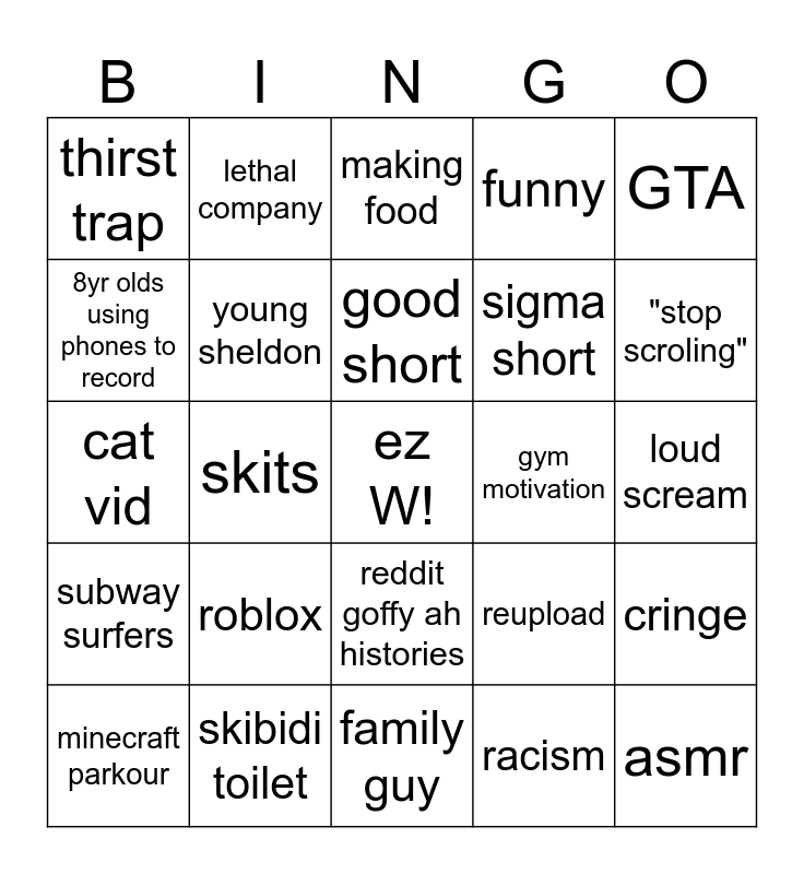 This bingo card has a free space and 24 words: roblox, skibidi toilet, good short, minecraft parkour, GTA, thirst trap, 8yr olds using phones to record, lethal company, gym motivation, reddit goffy ah histories, sigma short, cat vid, reupload, cringe, young sheldon, racism, loud scream, making food, "stop scroling", skits, asmr, subway surfers, funny and family guy.