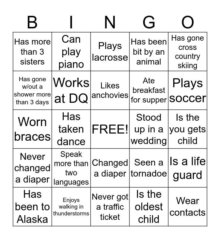 This bingo card has a free space and 24 words: Speak more than two languages, Enjoys walking in thunderstorms, Likes anchovies, Has been to Alaska, Has gone cross country skiing, Has more than 3 sisters, Has gone w/out a shower more than 3 days, Can play piano, Stood up in a wedding, Changed a diaper, Ate breakfast for supper, Worn braces, Seen a tornadoe, Is a life guard, Works at DQ, Is the oldest child, Is the you gets child, Plays lacrosse, Plays soccer, Has taken dance, Wear contacts, Never changed a diaper, Has been bit by an animal and Never got a traffic ticket.