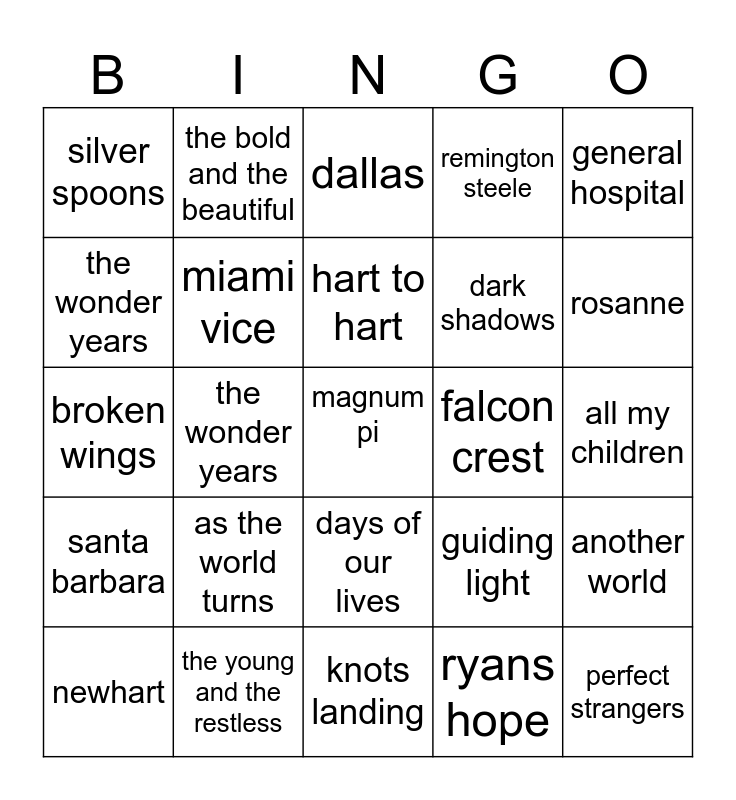 This bingo card has a free space and 24 words: as the world turns, the young and the restless, hart to hart, newhart, general hospital, silver spoons, the wonder years, the bold and the beautiful, falcon crest, days of our lives, dark shadows, broken wings, guiding light, another world, miami vice, ryans hope, all my children, dallas, rosanne, the wonder years, perfect strangers, santa barbara, remington steele and knots landing.