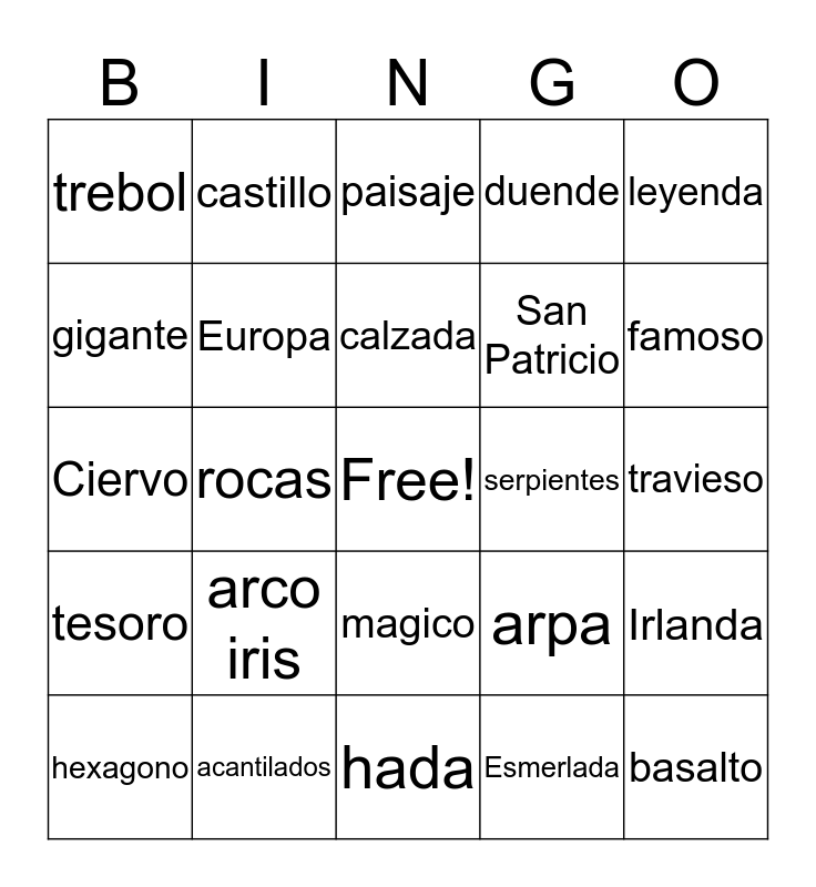This bingo card has a free space and 24 words: arco iris, acantilados, calzada, hexagono, leyenda, trebol, gigante, castillo, serpientes, magico, San Patricio, Ciervo, arpa, Irlanda, Europa, Esmerlada, travieso, paisaje, famoso, rocas, basalto, tesoro, duende and hada.