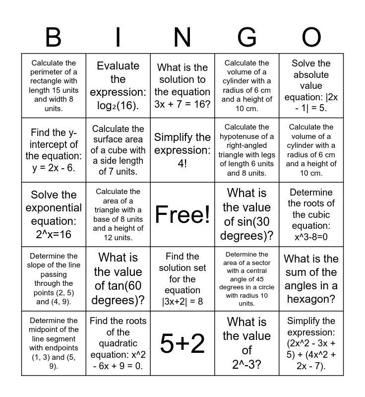 This bingo card has a free space and 24 words: What is the value of tan(60 degrees)?, Find the roots of the quadratic equation: x^2 - 6x + 9 = 0., Simplify the expression: 4!, Determine the midpoint of the line segment with endpoints (1, 3) and (5, 9)., Solve the absolute value equation: |2x - 1| = 5., Calculate the perimeter of a rectangle with length 15 units and width 8 units., Find the y-intercept of the equation: y = 2x - 6., Evaluate the expression: log₂(16)., What is the value of sin(30 degrees)?, Find the solution set for the equation |3x+2| = 8, Calculate the hypotenuse of a right-angled triangle with legs of length 6 units and 8 units., Solve the exponential equation: 2^x=16, Determine the area of a sector with a central angle of 45 degrees in a circle with radius 10 units., What is the sum of the angles in a hexagon?, Calculate the surface area of a cube with a side length of 7 units., What is the value of 2^-3?, Determine the roots of the cubic equation: x^3-8=0, What is the solution to the equation 3x + 7 = 16?, Calculate the volume of a cylinder with a radius of 6 cm and a height of 10 cm., Calculate the area of a triangle with a base of 8 units and a height of 12 units., Simplify the expression: (2x^2 - 3x + 5) + (4x^2 + 2x - 7)., Determine the slope of the line passing through the points (2, 5) and (4, 9)., Calculate the volume of a cylinder with a radius of 6 cm and a height of 10 cm. and 5+2.