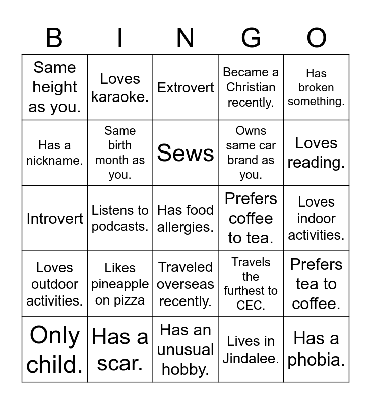 This bingo card has 25 words: Likes pineapple on pizza, Has an unusual hobby., Sews, Only child., Has broken something., Same height as you., Has a nickname., Loves karaoke., Prefers coffee to tea., Traveled overseas recently., Owns same car brand as you., Introvert, Travels the furthest to CEC., Prefers tea to coffee., Same birth month as you., Has a phobia., Loves indoor activities., Extrovert, Loves reading., Listens to podcasts., Has food allergies., Has a scar., Loves outdoor activities., Became a Christian recently. and Lives in Jindalee..