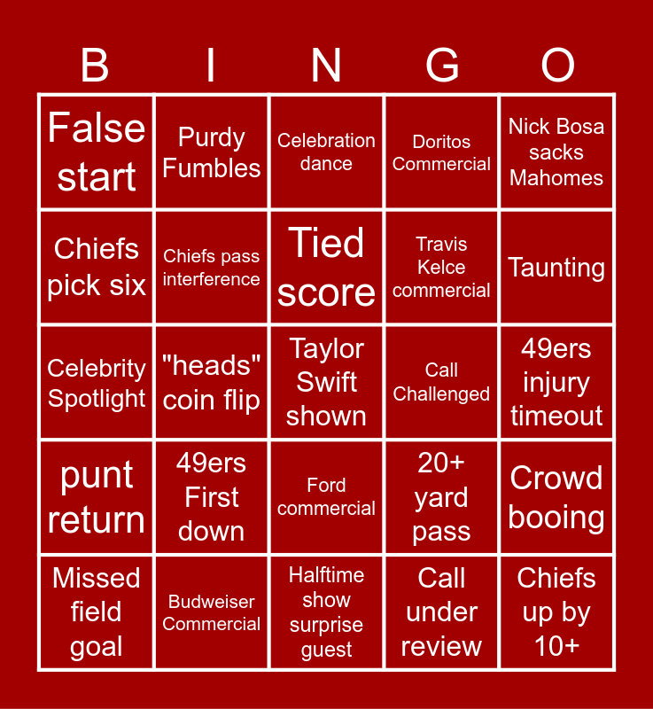 This bingo card has a free space and 24 words: 49ers First down, Budweiser Commercial, Tied score, Missed field goal, Nick Bosa sacks Mahomes, False start, Chiefs pick six, Purdy Fumbles, Call Challenged, Ford commercial, Travis Kelce commercial, Celebrity Spotlight, 20+ yard pass, Crowd booing, Chiefs pass interference, Call under review, 49ers injury timeout, Celebration dance, Taunting, "heads" coin flip, Chiefs up by 10+, punt return, Doritos Commercial and Halftime show surprise guest.