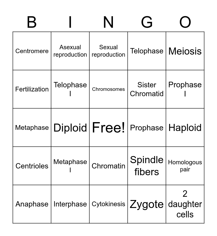 This bingo card has a free space and 28 words: Homologous pair, Crossover, Sister Chromatid, Zygote, Fertilization, Sexual reproduction, Asexual reproduction, Centrioles, Prophase, Anaphase, Metaphase, Telophase, Interphase, Cytokinesis, Prophase I, Anaphase I, Metaphase I, Telophase I, Chromosomes, Chromatin, Centromere, 4 daughter cells, 2 daughter cells, Diploid, Haploid, Spindle fibers, Meiosis and Mitosis.
