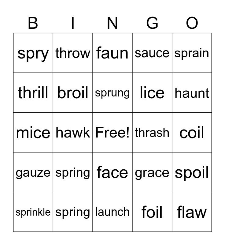 This bingo card has a free space and 24 words: spring, spring, sprung, sprinkle, sprain, spry, thrill, throw, thrash, face, lice, mice, grace, spoil, broil, foil, coil, faun, haunt, hawk, flaw, gauze, sauce and launch.