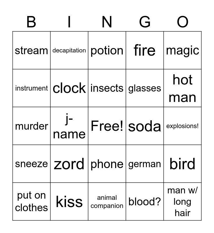 This bingo card has a free space and 24 words: zord, kiss, insects, put on clothes, magic, stream, instrument, decapitation, soda, phone, glasses, murder, german, bird, clock, blood?, explosions!, potion, hot man, j-name, man w/ long hair, sneeze, fire and animal companion.