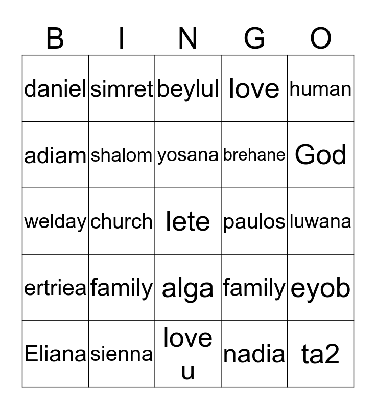 This bingo card has a free space and 24 words: family, sienna, yosana, Eliana, human, daniel, adiam, simret, paulos, alga, brehane, welday, family, eyob, shalom, nadia, luwana, beylul, God, church, ta2, ertriea, love and love u.