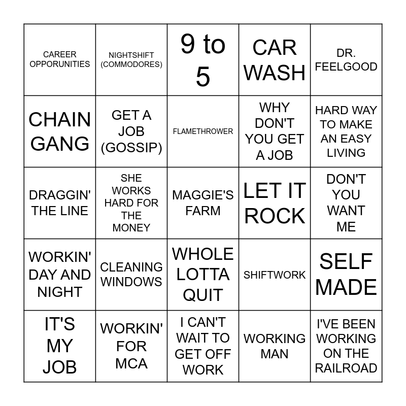 This bingo card has 80 words: 48 HOURS, 5 O'CLOCK WORLD, 9 to 5, A HARD DAY'S NIGHT, ALL IN A DAY'S WORK, ASSEMBLY LINE, BANG THE DRUM ALL DAY, BARTENDER, BLUE COLLAR MAN, BOW RIVER, BUSY EARNIN', BUSY MAN, CAR WASH, CAREER OPPORUNITIES, CAUGHT UP, CHAIN GANG, CIVIL TWILIGHT, CLEANING WINDOWS, DOCTOR! DOCTOR!, DON'T YOU WANT ME, DOOR TO DOOR, DR. FEELGOOD, DRAGGIN' THE LINE, FLAMETHROWER, GET A JOB (GOSSIP), GET A JOB (THE SILHOUETTES), GOD BLESS SATURDAY, GOT A JOB, HANDS OF A WORKIN' MAN, HARD HAT AND A HAMMER, HARD WAY TO MAKE AN EASY LIVING, HEIGH-HO, I CAN'T WAIT TO GET OFF WORK, I'VE BEEN WORKING ON THE RAILROAD, IT'S MY JOB, LET IT ROCK, LET'S WORK, LIVIN' ON A PRAYER, LORD HAVE MERCY ON THE WORKING MAN, MAGGIE'S FARM, MANIAC, MANIC MONDAY, MONEY FOR NOTHING, MORNIG TRAIN (NINE TO FIVE), NIGHT SHIFT (JON PARDI), NIGHTSHIFT (COMMODORES), ON MY WAY TO WORK, OPPORTUNITIES (LET'S MAKE LOTS OF MONEY), OUT HERE GRINDIN', PEACE OF MIND, SELF MADE, SHE WORKS HARD FOR THE MONEY, SHIFTWORK, TAKE THIS JOB AND SHOVE IT, TAKIN' CARE OF BUSINESS, THE SCIENTIST, WE WORK THE BLACK SEAM, WELCOME TO THE WORKING WEEK, WHISTLE WHILE YOU WORK, WHOLE LOTTA QUIT, WHY DON'T YOU GET A JOB, WORK (RIHANNA), WORK (IGGY AZALEA), WORK (KELLY ROWLAND), WORK BITCH, WORK FROM HOME, WORK HARD, PLAY HARDER, WORK IT, WORKER'S SONG, WORKIN' FOR A LIVIN, WORKIN' DAY AND NIGHT, WORKIN' FOR MCA, WORKING CLASS HERO, WORKING FOR THE WEEKEND, WORKING GIRL, WORKING IN A COAL MINE, WORKING MAN, WORKING MAN BLUES, WORKING MAN'S PH. D and WORKING ON THE HIGHWAY.