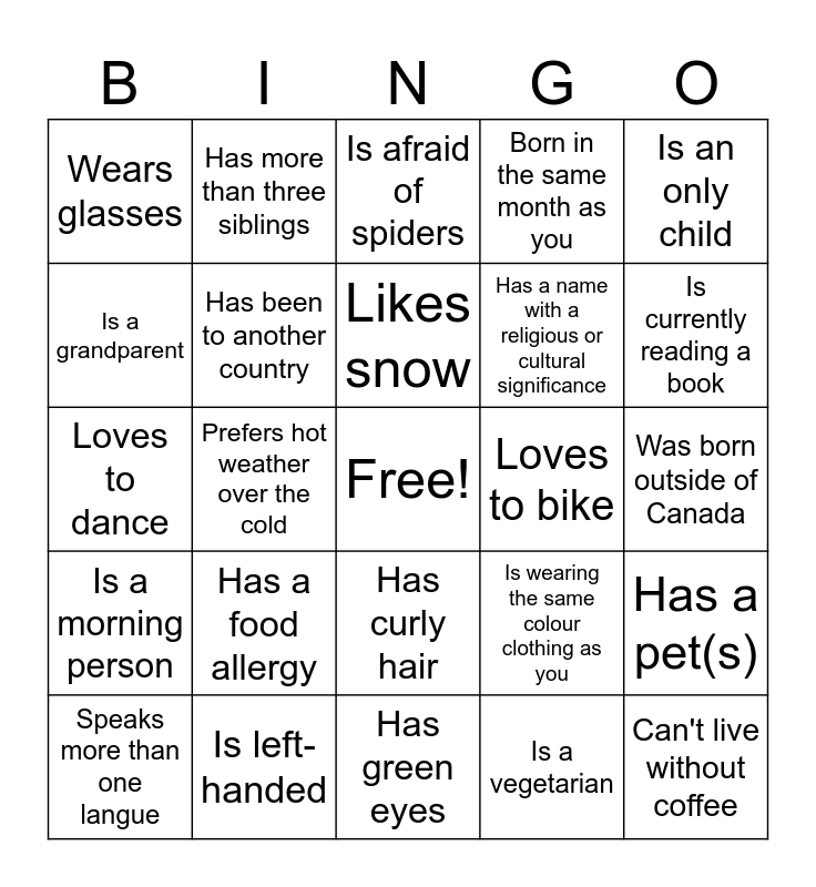 This bingo card has a free space and 24 words: Has a food allergy, Is left-handed, Likes snow, Speaks more than one langue, Is an only child, Wears glasses, Is a grandparent, Has more than three siblings, Loves to bike, Has curly hair, Has a name with a religious or cultural significance, Loves to dance, Is wearing the same colour clothing as you, Has a pet(s), Has been to another country, Is a vegetarian, Was born outside of Canada, Is afraid of spiders, Is currently reading a book, Prefers hot weather over the cold, Can't live without coffee, Is a morning person, Born in the same month as you and Has green eyes.
