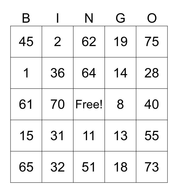 This bingo card has a free space and 24 words: 31, 32, 64, 65, 75, 45, 1, 2, 8, 11, 14, 61, 13, 55, 36, 18, 40, 62, 28, 70, 73, 15, 19 and 51.