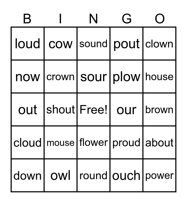 This bingo card has a free space and 24 words: mouse, owl, sour, down, clown, loud, now, cow, our, flower, plow, out, proud, about, crown, ouch, brown, sound, house, shout, power, cloud, pout and round.