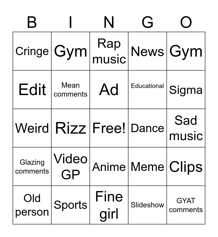 This bingo card has a free space and 24 words: Video GP, Sports, Ad, Old person, Gym, Cringe, Edit, Gym, Dance, Anime, Educational, Weird, Meme, Clips, Mean comments, Slideshow, Sad music, Rap music, Sigma, Rizz, GYAT comments, Glazing comments, News and Fine girl.