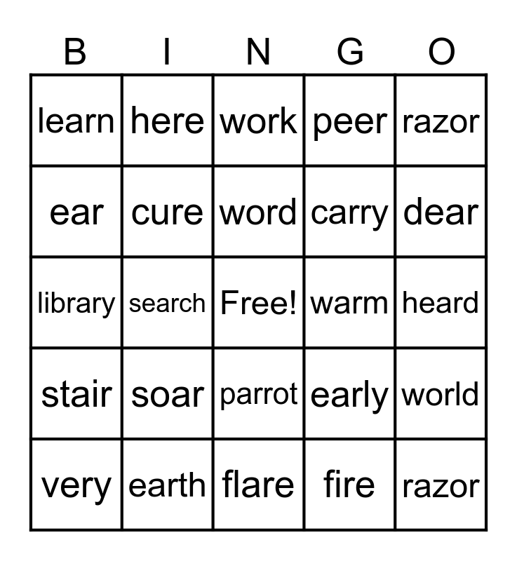 This bingo card has a free space and 24 words: soar, earth, word, very, razor, learn, ear, here, warm, parrot, carry, library, early, world, cure, fire, heard, work, dear, search, razor, stair, peer and flare.