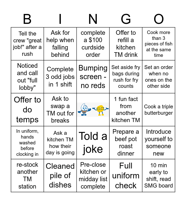 This bingo card has a free space and 24 words: Ask a kitchen TM how their day is going, Cleaned pile of dishes, Bumping screen -no reds, re-stock another TM station, Cook more than 3 pieces of fish at the same time, Tell the crew "great job!" after a rush, Noticed and call out "full lobby", Ask for help when falling behind, 1 fun fact from another kitchen TM, Told a joke, Set aside fry bags during rush for fry counts, Offer to do temps, Prepare a beef pot roast dinner, Introduce yourself to someone new, Complete 3 odd jobs in 1 shift, Full uniform check, Cook a triple butterburger, complete a $100 curdside order, Set an order when no ones on the other side, Ask to swap a TM out for breaks, 10 min early to shift, read SMG board, In uniform, hands washed before clocking in, Offer to refill a kitchen TM drink and Pre-close kitchen or midday list complete.