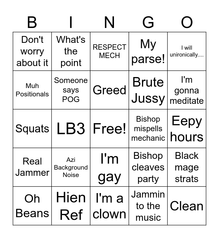 This bingo card has a free space and 24 words: Azi Background Noise, Hien Ref, Greed, Oh Beans, I will unironically...., Don't worry about it, Muh Positionals, What's the point, Bishop mispells mechanic, I'm gay, Brute Jussy, Squats, Bishop cleaves party, Black mage strats, Someone says POG, Jammin to the music, Eepy hours, RESPECT MECH, I'm gonna meditate, LB3, Clean, Real Jammer, My parse! and I'm a clown.