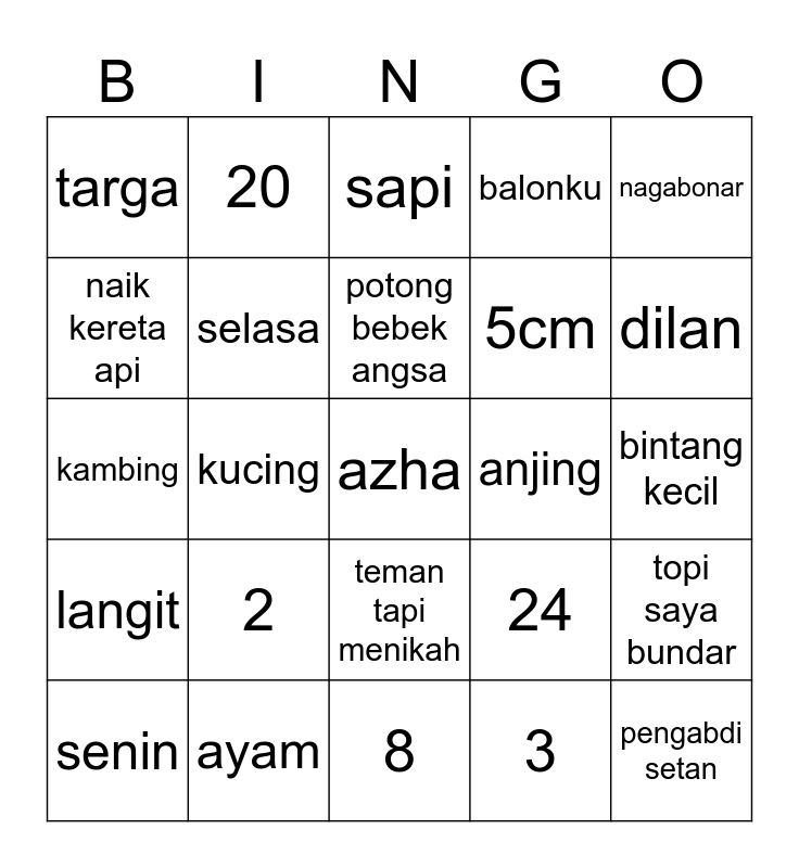 This bingo card has a free space and 24 words: 2, ayam, potong bebek angsa, senin, nagabonar, targa, naik kereta api, 20, anjing, teman tapi menikah, 5cm, kambing, 24, topi saya bundar, selasa, 3, bintang kecil, sapi, dilan, kucing, pengabdi setan, langit, balonku and 8.