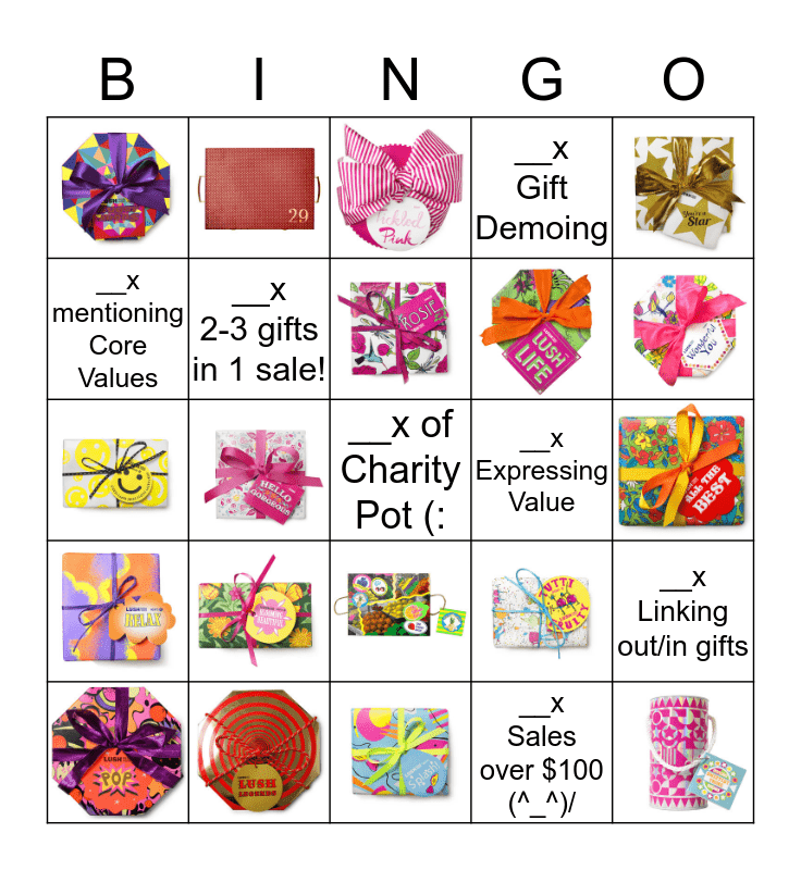 This bingo card has 18 images, a free space and 6 words: __x mentioning Core Values, __x Expressing Value, __x Linking out/in gifts, __x 2-3 gifts in 1 sale!, __x Sales over $100 (^_^)/ and __x Gift Demoing.