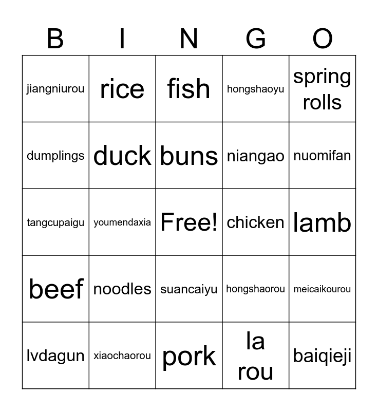 This bingo card has a free space and 24 words: noodles, xiaochaorou, buns, lvdagun, spring rolls, jiangniurou, dumplings, rice, chicken, suancaiyu, niangao, tangcupaigu, hongshaorou, meicaikourou, duck, la rou, lamb, fish, nuomifan, youmendaxia, baiqieji, beef, hongshaoyu and pork.