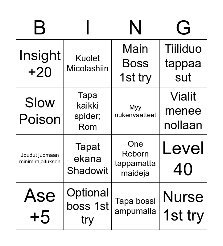 This bingo card has 16 words: Optional boss 1st try, Level 40, Main Boss 1st try, Insight +20, Joudut juomaan minimirajoituksen, Kuolet Micolashiin, One Reborn tappamatta maideja, Tapa bossi ampumalla, Slow Poison, Tapa kaikki spider; Rom, Ase +5, Tiiliduo tappaa sut, Tapat ekana Shadowit, Vialit menee nollaan, Myy nukenvaatteet and Nurse 1st try.