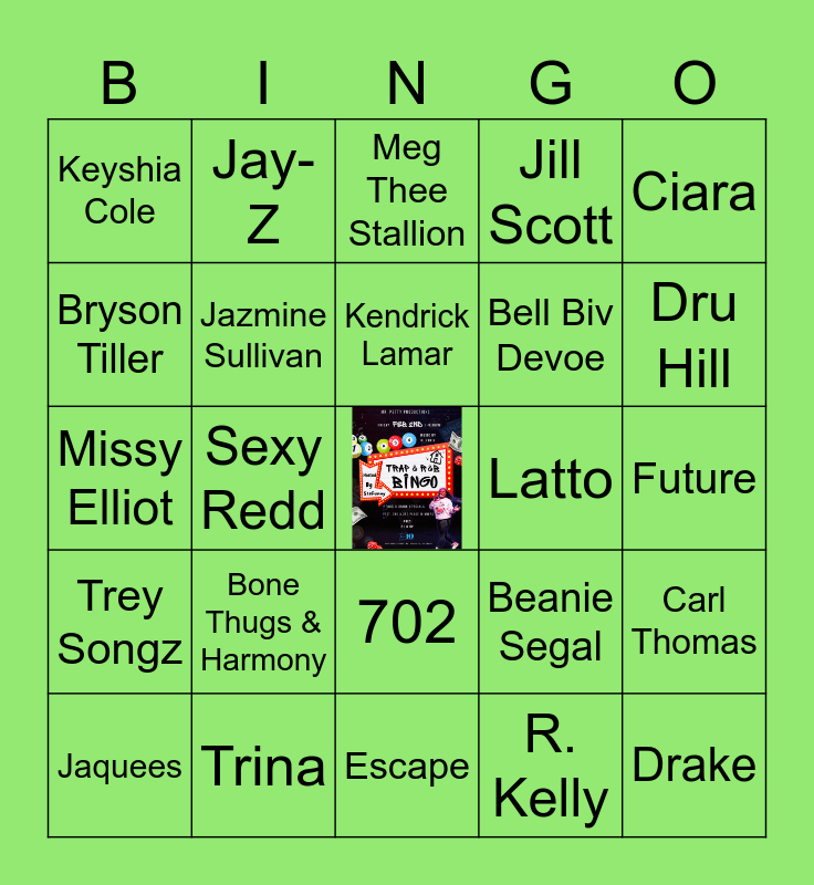 This bingo card has a free space and 24 words: Bone Thugs & Harmony, Trina, Kendrick Lamar, Jaquees, Ciara, Keyshia Cole, Bryson Tiller, Jay-Z, Latto, 702, Bell Biv Devoe, Missy Elliot, Beanie Segal, Carl Thomas, Jazmine Sullivan, R. Kelly, Future, Meg Thee Stallion, Dru Hill, Sexy Redd, Drake, Trey Songz, Jill Scott and Escape.