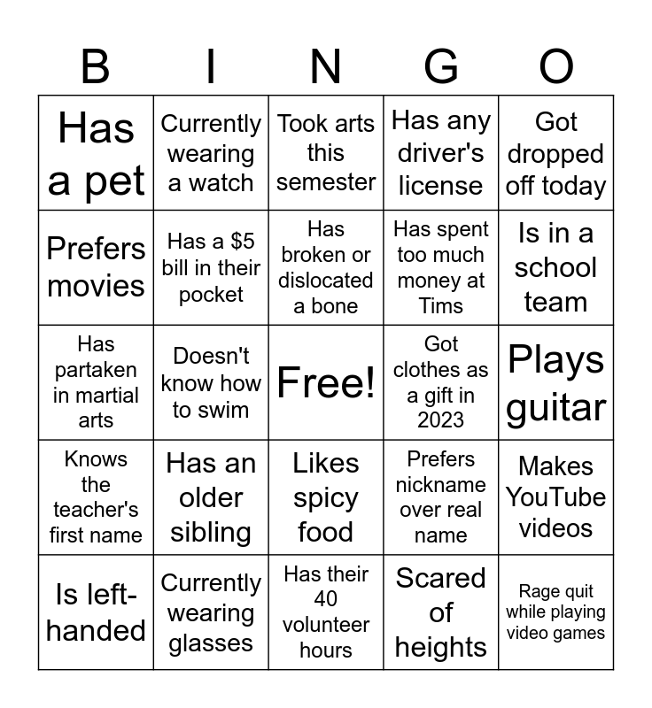 This bingo card has a free space and 24 words: Has an older sibling, Currently wearing glasses, Has broken or dislocated a bone, Is left-handed, Got dropped off today, Has a pet, Prefers movies, Currently wearing a watch, Got clothes as a gift in 2023, Likes spicy food, Has spent too much money at Tims, Has partaken in martial arts, Prefers nickname over real name, Makes YouTube videos, Has a $5 bill in their pocket, Scared of heights, Plays guitar, Took arts this semester, Is in a school team, Doesn't know how to swim, Rage quit while playing video games, Knows the teacher's first name, Has any driver's license and Has their 40 volunteer hours.