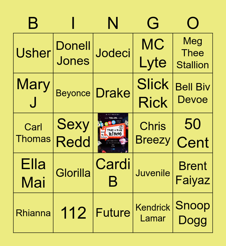 This bingo card has a free space and 29 words: Rhianna, TLC, Sexy Redd, Boyz II Men, Usher, Jodeci, Beyonce, Glorilla, Chris Breezy, 112, 50 Cent, Snoop Dogg, Future, Kendrick Lamar, Bell Biv Devoe, Trey Songz, Cardi B, Ella Mai, Meg Thee Stallion, Carl Thomas, Juvenile, Queen Latifah, Slick Rick, Mary J, MC Lyte, Donell Jones, Brent Faiyaz, Drake and Trina.