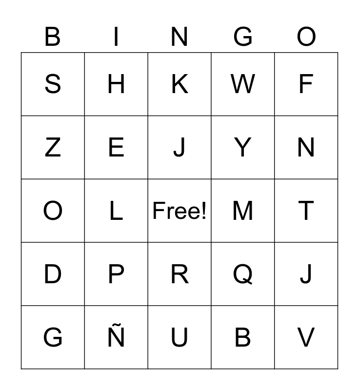 This bingo card has a free space and 34 words: A, B, C, Ch, D, E, F, G, H, I, J, K, L, LL, M, N, Ñ, O, P, Q, R, RR, S, T, U, V, W, X, Y, Z, M, L, J and H.