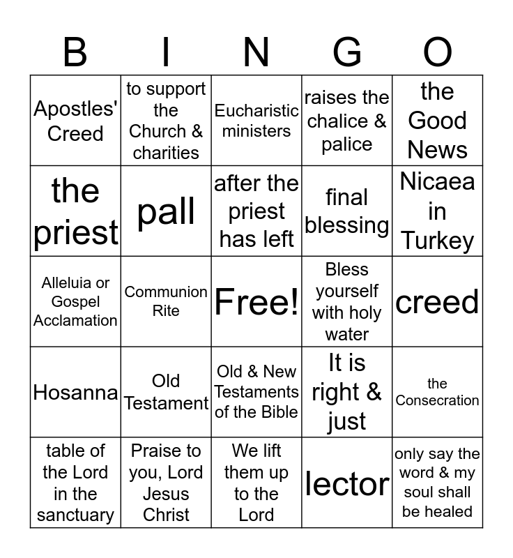 This bingo card has a free space and 45 words: the Lamb of God, only say the word & my soul shall be healed, kneel & have quiet time in prayer, table of the Lord in the sanctuary, cantor, lector, Eucharistic ministers, shake hands with people around you, the Good News, Praise to you, Lord Jesus Christ, raises the chalice & palice, Bless yourself with holy water, Old & New Testaments of the Bible, Old Testament, apostles, mostly St. Paul, We lift them up to the Lord, Thanks be to God, Alleluia or Gospel Acclamation, as a sign of respect, Nicaea in Turkey, to support the Church & charities, I believe in God & Jesus Christ, Nicene Creed, Apostles' Creed, Lord, hear our prayer, creed, bread & wine, New Testament, It is right & just, Hosanna, the consecration, the Consecration, Memorial Acclamation, So be it, Homily, Communion Rite, Peace be with you, Amen, in the tabernacle, after the priest has left, the priest, final blessing, finger bowl, pall and missal.