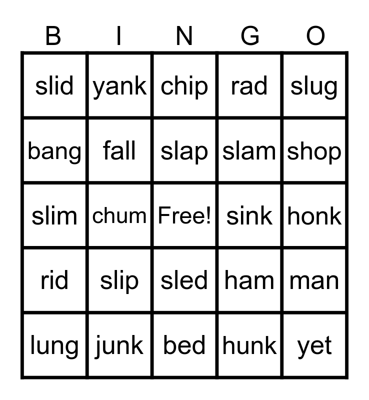 This bingo card has a free space and 24 words: slip, junk, slap, lung, slug, slid, bang, yank, sink, sled, slam, slim, ham, man, fall, hunk, honk, chip, shop, chum, yet, rid, rad and bed.
