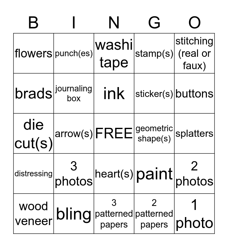 This bingo card has a free space and 24 words: 3 photos, bling, ink, wood veneer, stitching (real or faux), flowers, brads, punch(es), geometric shape(s), heart(s), sticker(s), die cut(s), paint, 2 photos, journaling box, 2 patterned papers, splatters, washi tape, buttons, arrow(s), 1 photo, distressing, stamp(s) and 3 patterned papers.