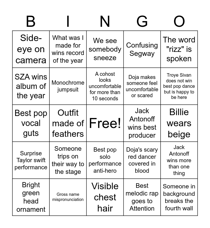 This bingo card has a free space and 24 words: Someone trips on their way to the stage, Gross name mispronunciation, A cohost looks uncomfortable for more than 10 seconds, Bright green head ornament, The word "rizz" is spoken, Side-eye on camera, SZA wins album of the year, What was I made for wins record of the year, Jack Antonoff wins best producer, Best pop solo performance anti-hero, Doja makes someone feel uncomfortable or scared, Best pop vocal guts, Doja's scary red dancer covered in blood, Jack Antonoff wins more than one thing, Monochrome jumpsuit, Best melodic rap goes to Attention, Billie wears beige, We see somebody sneeze, Troye Sivan does not win best pop dance but is happy to be here, Outfit made of feathers, Someone in background breaks the fourth wall, Surprise Taylor swift performance, Confusing Segway and Visible chest hair.